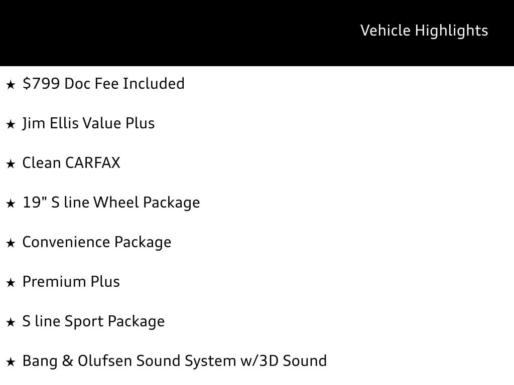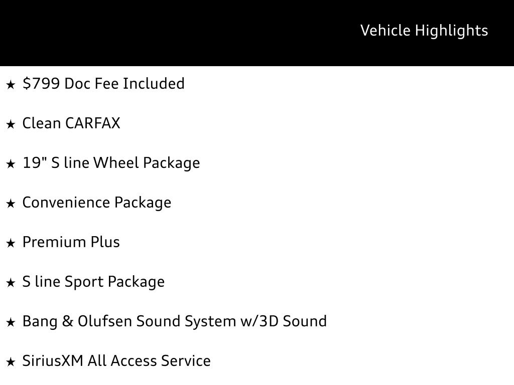 The Premium Plus package enhances your driving pleasure with features like the stunning Bang & Olufsen Sound System with 3D Sound, providing an immersive audio experience. The S line Sport Package adds a touch of sportiness with illuminated S line stainless steel front door sills, S line Fender Badges, and Aluminum Trimaran Inlays. The 19-inch S line Wheel Package completes the dynamic look with its striking 5-Parallel-Spoke Design.