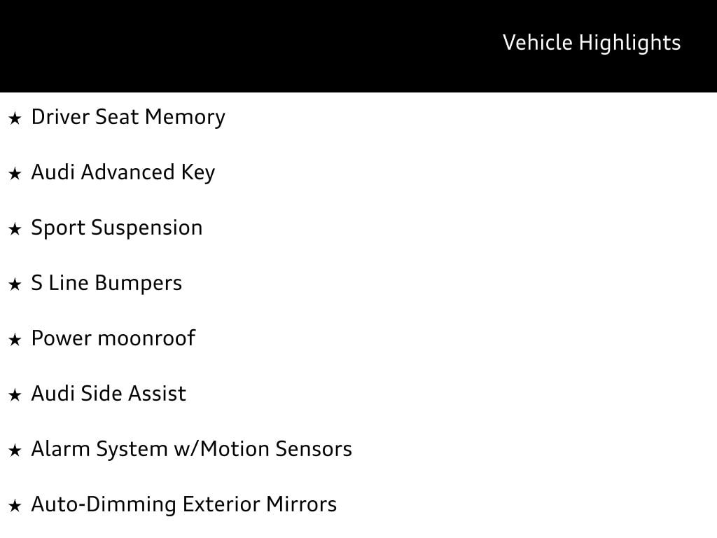 Elevate your driving experience with the impressive performance of the 2.0L 4-Cylinder TFSI engine, paired with the responsive 7-Speed Automatic S tronic transmission and quattro all-wheel drive system. Enjoy exceptional fuel efficiency, with an EPA-estimated 23 city/34 highway MPG.