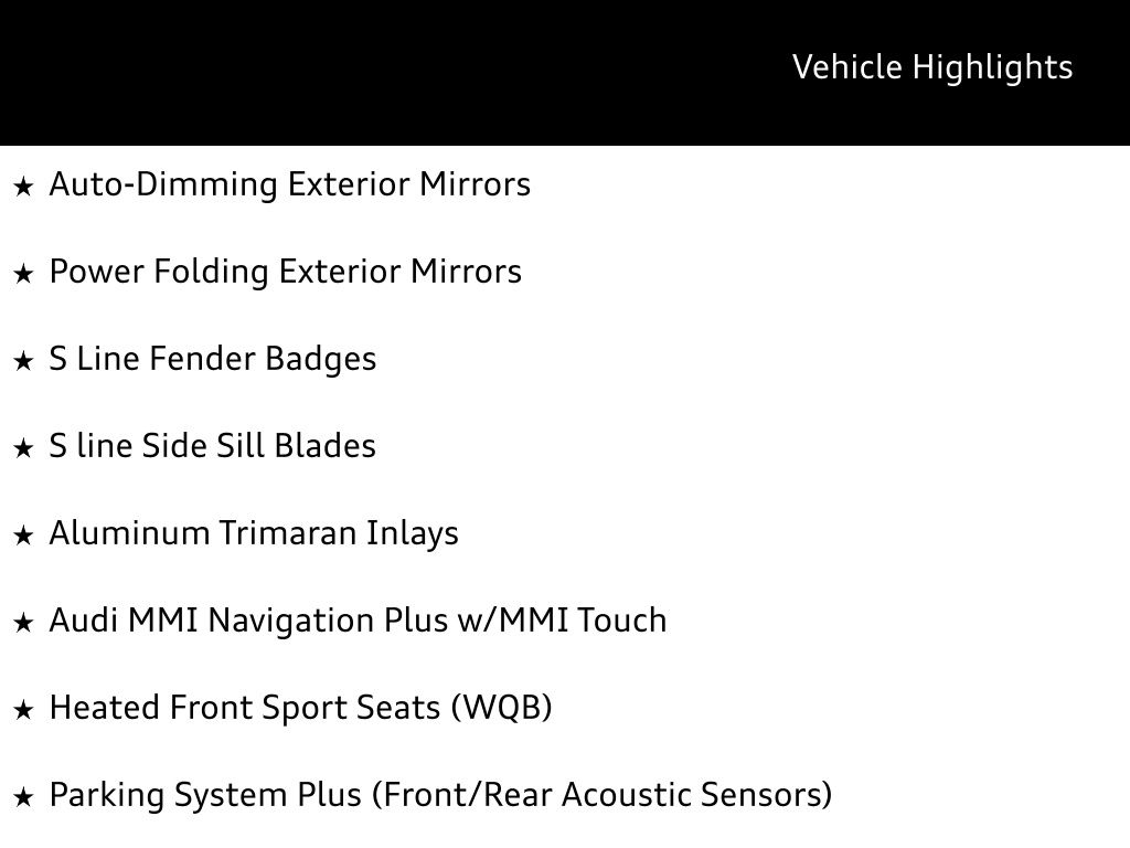 Comfort and convenience are at the forefront, with features such as Heated Front Sport Seats, Ventilated Front Seats, and Rear Seat USB Charge Ports. The Audi Advanced Key allows you to start the engine and access the vehicle with ease, while the Audi Side Assist and Parking System Plus provide added peace of mind during your daily commute.