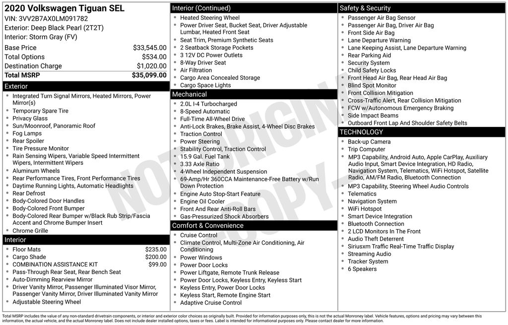 Step inside this well-appointed Tiguan and discover a cabin that caters to your every need. Enjoy the convenience of the Discover Media AM/FM/HD Radio system, the versatility of the 60/40 split-folding rear seats, and the added security of the Forward Collision Warning system with Autonomous Emergency Braking. With an EPA-estimated 20 MPG in the city and 27 MPG on the highway, this Tiguan strikes the perfect balance between performance and efficiency.