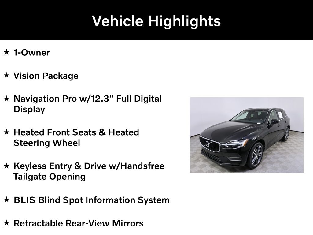 The XC60 T5 Momentum is equipped with a powerful yet efficient I4 engine, paired with an Automatic with Geartronic transmission and All-Wheel Drive, delivering an impressive 22 city/28 highway MPG. This SUV is designed to elevate your driving experience with its suite of advanced features, including the Navigation Pro system with a stunning 12.3" full digital display, the Vision Package with advanced safety and convenience technologies, and the Heated Front Seats and Heated Steering Wheel for year-round comfort.